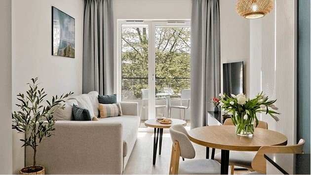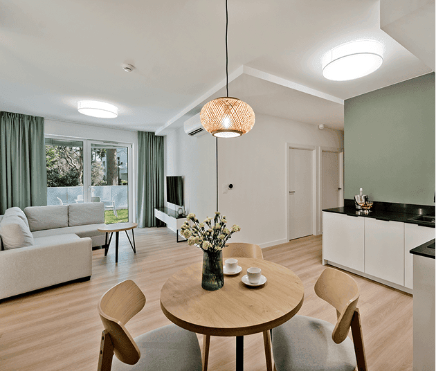 Apartamenty w LIDO oferują więcej przestrzeni i swobody, niż może dać nawet najlepszy pokój hotelowy. Każdy z nich został starannie zaprojektowany z myślą o komforcie codziennego wypoczynku — z funkcjonalnym układem, wysokiej jakości wykończeniem i dbałością o detale. Wszystkie apartamenty posiadają w pełni wyposażony aneks kuchenny, który pozwala zachować niezależność i elastyczność podczas pobytu.
