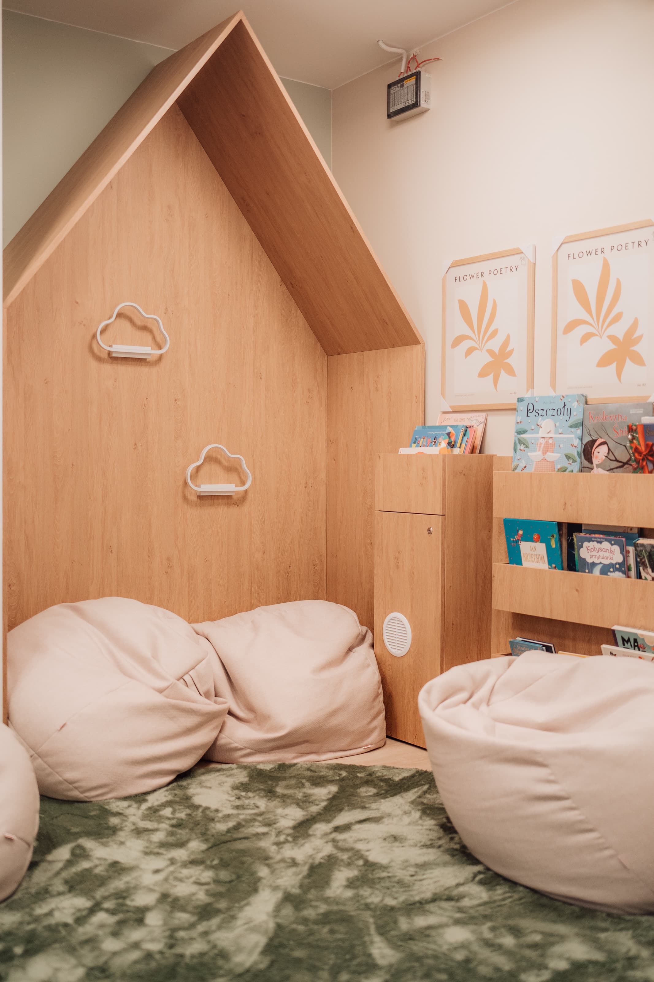 Miękkie pufy, naturalne materiały i starannie dobrana biblioteka książek dla dzieci tworzą przyjazną, bezpieczną przestrzeń sprzyjającą relaksowi i wyobraźni. To cichy azyl, w którym można poczytać, posłuchać historii lub po prostu poleżeć i wyhamować tempo.